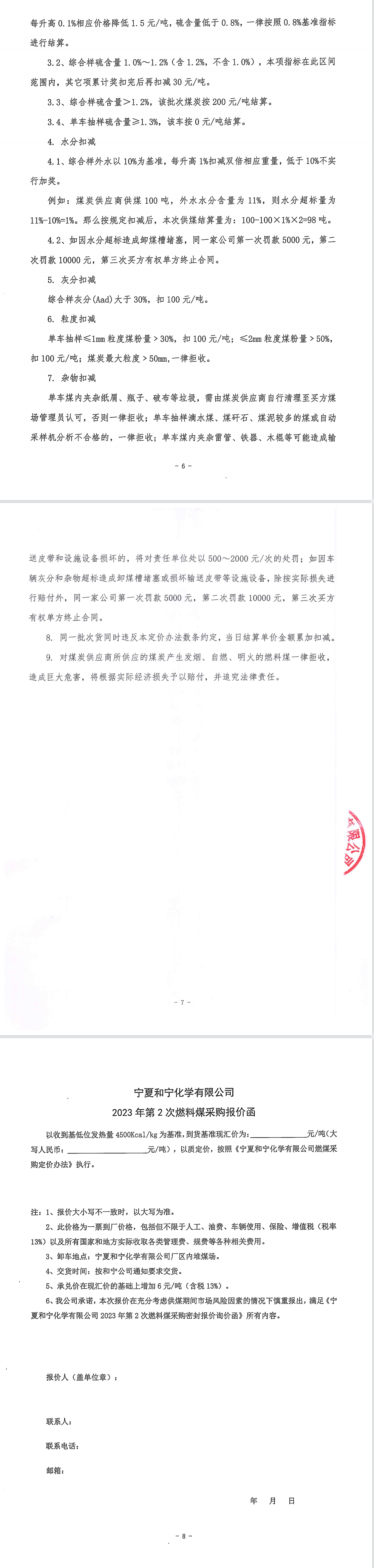 寧夏和寧化學有限公司2023年第2次燃料煤采購密封報價詢價函