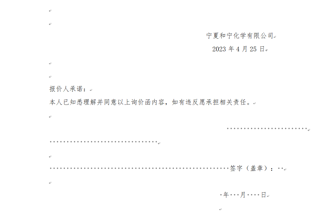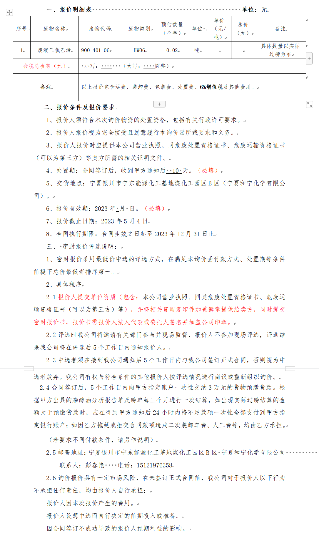 寧夏和寧化學有限公司廢液三氯乙烯報價函(密封報價)