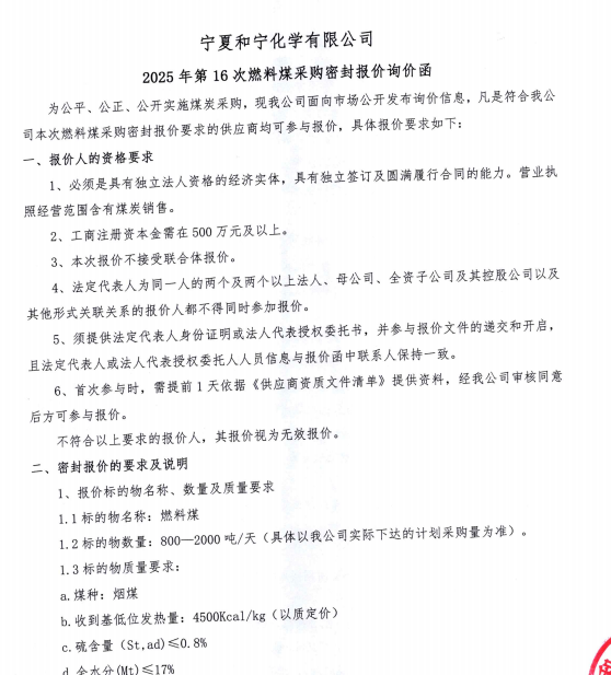 寧夏和寧化學有限公司2025年第16次燃料煤采購密封報價詢價函.pdf