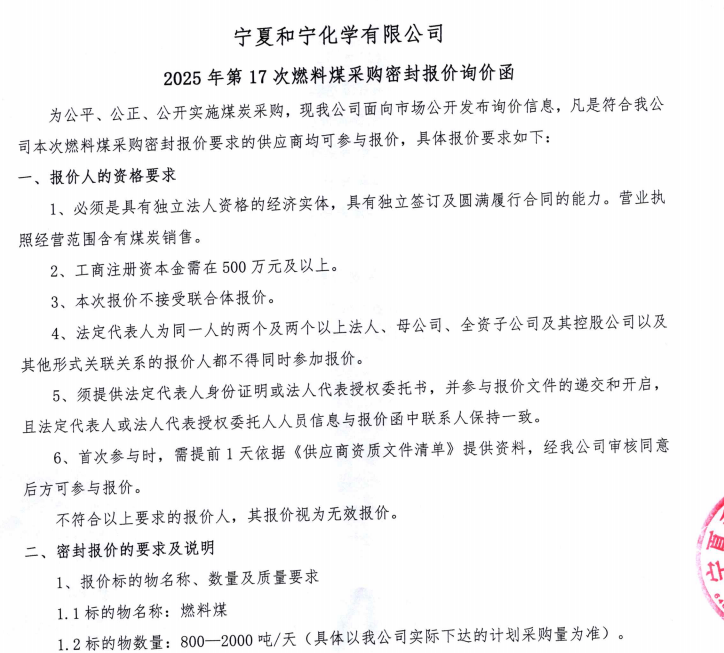 寧夏和寧化學有限公司2025年第17次燃料煤采購密封報價詢價函.pdf