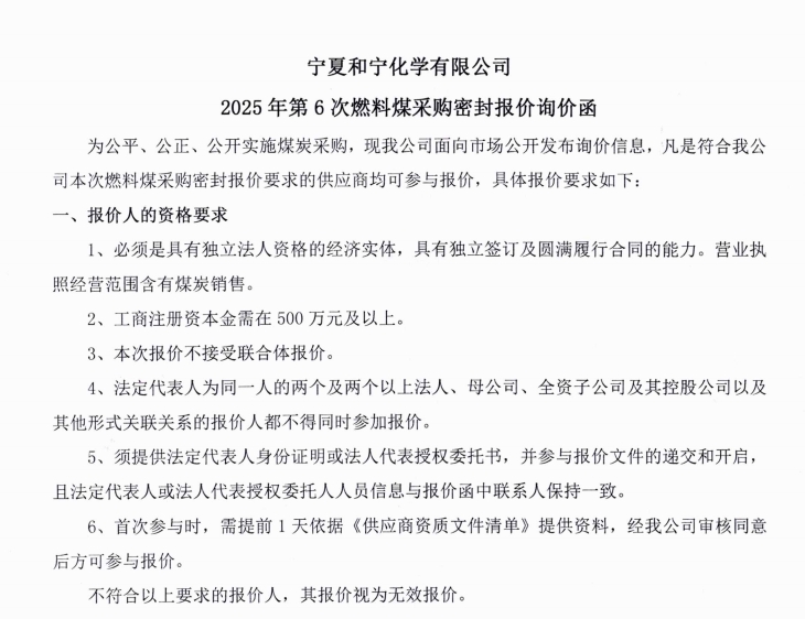 2025-04-02寧夏和寧化學有限公司2025年第6次燃料煤采購密封報價詢價函.pdf [全文]