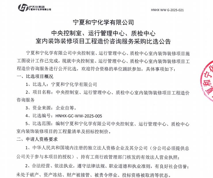 2025-04-09寧夏和寧化學有限公司中央控制室、運行管理中心、質檢中心室內裝飾裝修項目工程造價咨詢服務采購比選公告.pdf [全文]