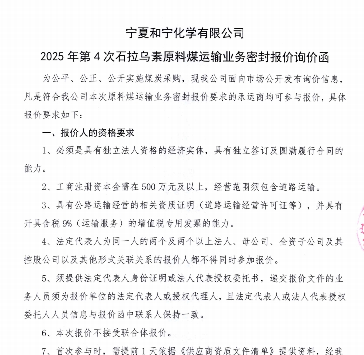 2025-04-09寧夏和寧化學有限公司2025 年第4次石拉烏素原料煤運輸業務密封報價詢價函.pdf [全文]
