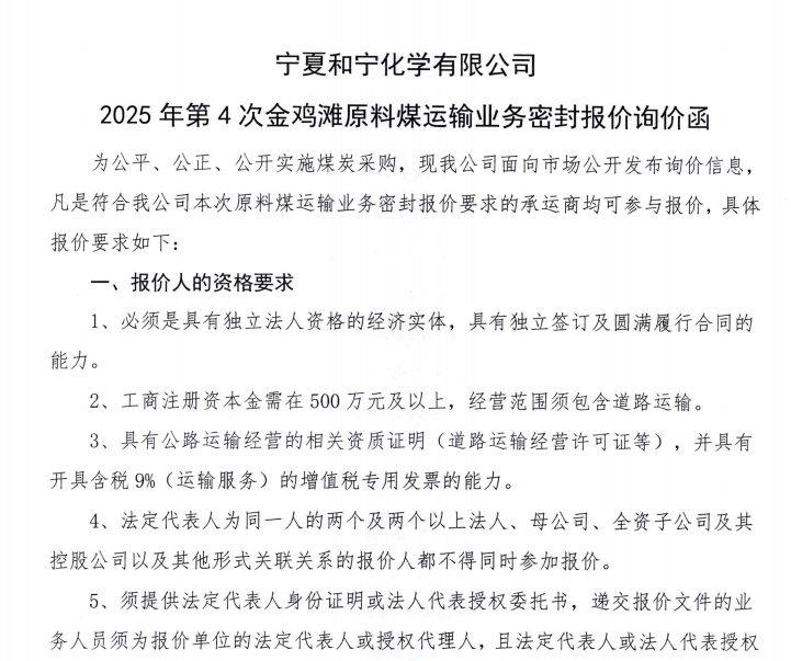 2025-04-11寧夏和寧化學有限公司2025 年第4次金雞灘原料煤運輸業務密封報價詢價函.pdf [全文]