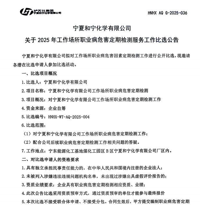 2025-04-09寧夏和寧化學有限公司關于 2025 年工作場所職業病危害定期檢測服務工作比選公告.pdf [全文]