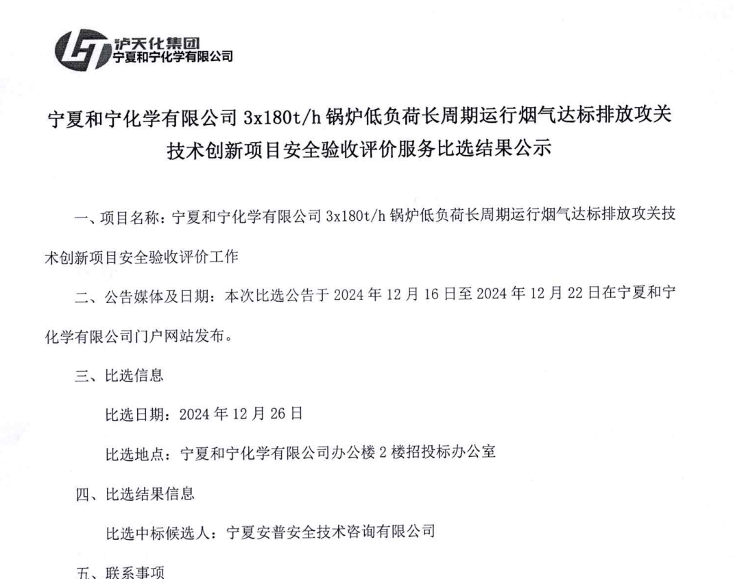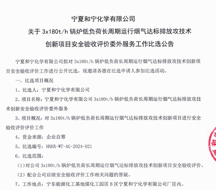 2024-12-18寧夏和寧化學有限公司關于 3x180t/h鍋爐低負荷長周期運行煙氣達標排放攻技術創新項目安全驗收評價委外服務工作比選公告.pdf [全文]