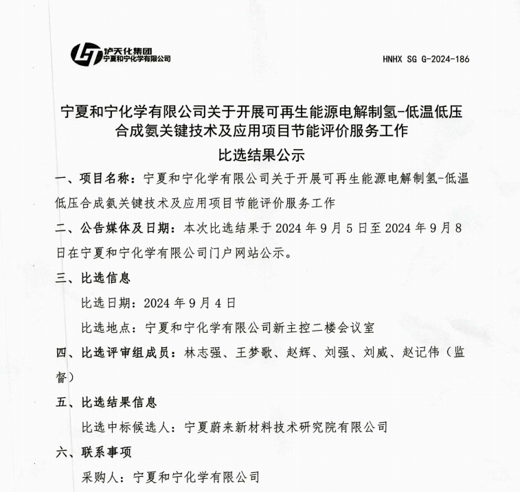 2024-09-11寧夏和寧化學有限公司關于開展可再生能源電解制氫-低溫低壓合成氨關鍵技術及應用項目節能評價服務工作比選結果公示.pdf [全文]