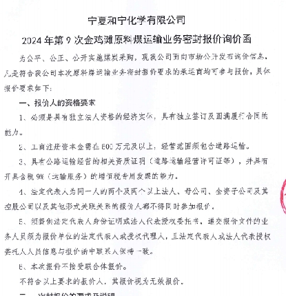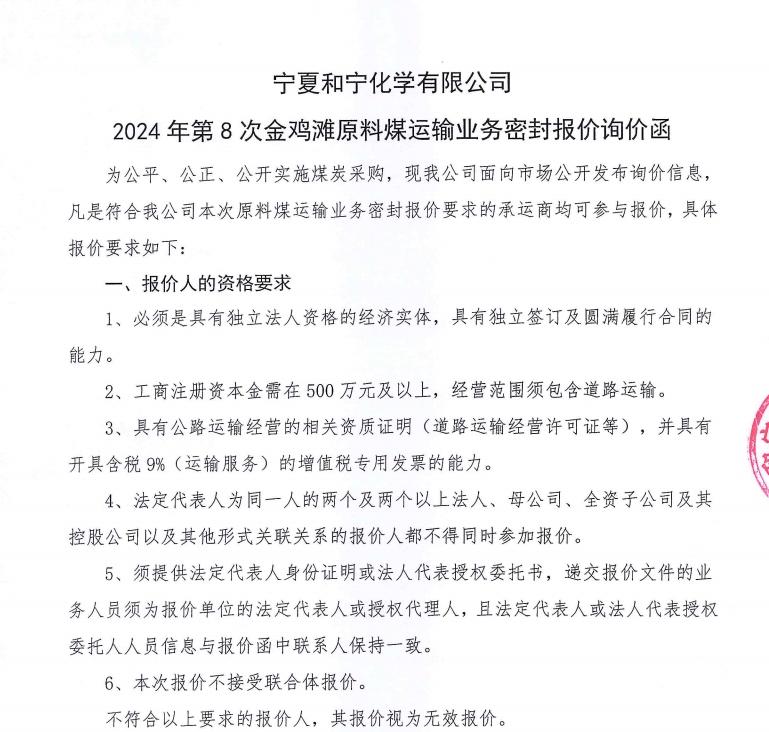 2024-09-11寧夏和寧化學有限公司2024 年第8次金雞灘原料煤運輸業務密封報價詢價函.pdf [全文]
