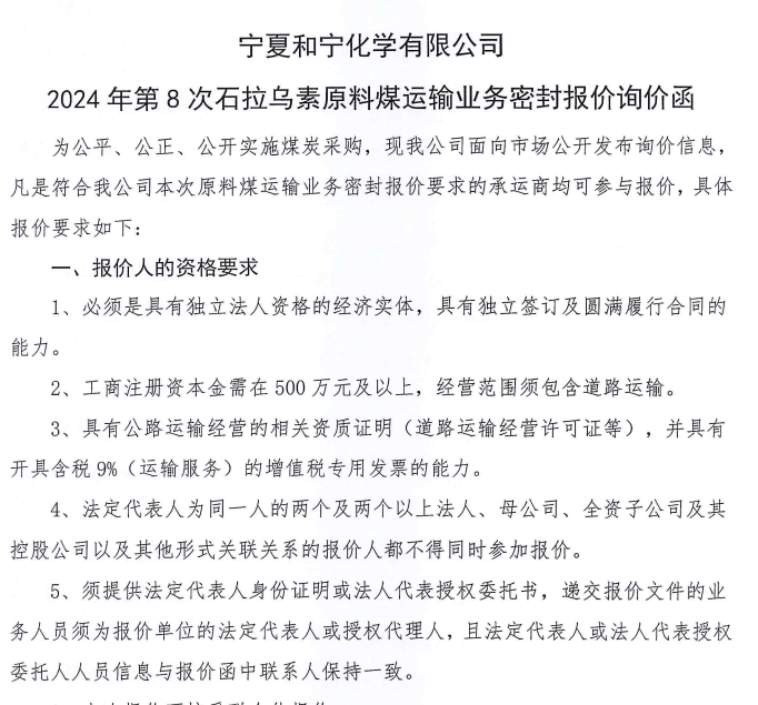 2024-09-12寧夏和寧化學有限公司2024年第8次石拉烏素原料煤運輸業務密封報價詢價函.pdf [全文]