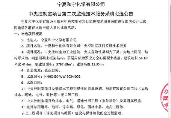 寧夏和寧化學有限公司中央控制室項目第二次監理技術服務采購比選公告.pdf [全文]
