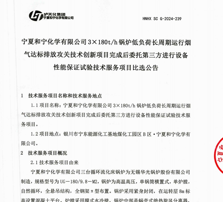 2024-08-26寧夏和寧化學有限公司3x180t/h鍋爐低負荷長周期運行煙氣達標排放攻關技術創新項目完成后委托第三方進行設備性能保證試驗技術服務項目比選公告.pdf [全文]