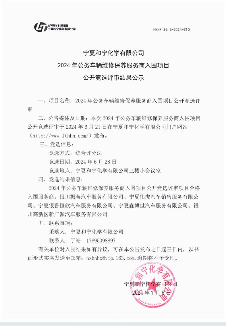 2024-07-09寧夏和寧化學(xué)有限公司2024年公務(wù)車輛維修保養(yǎng)服務(wù)商入圍項(xiàng)目公開競選評審結(jié)果公示.pdf [全文]