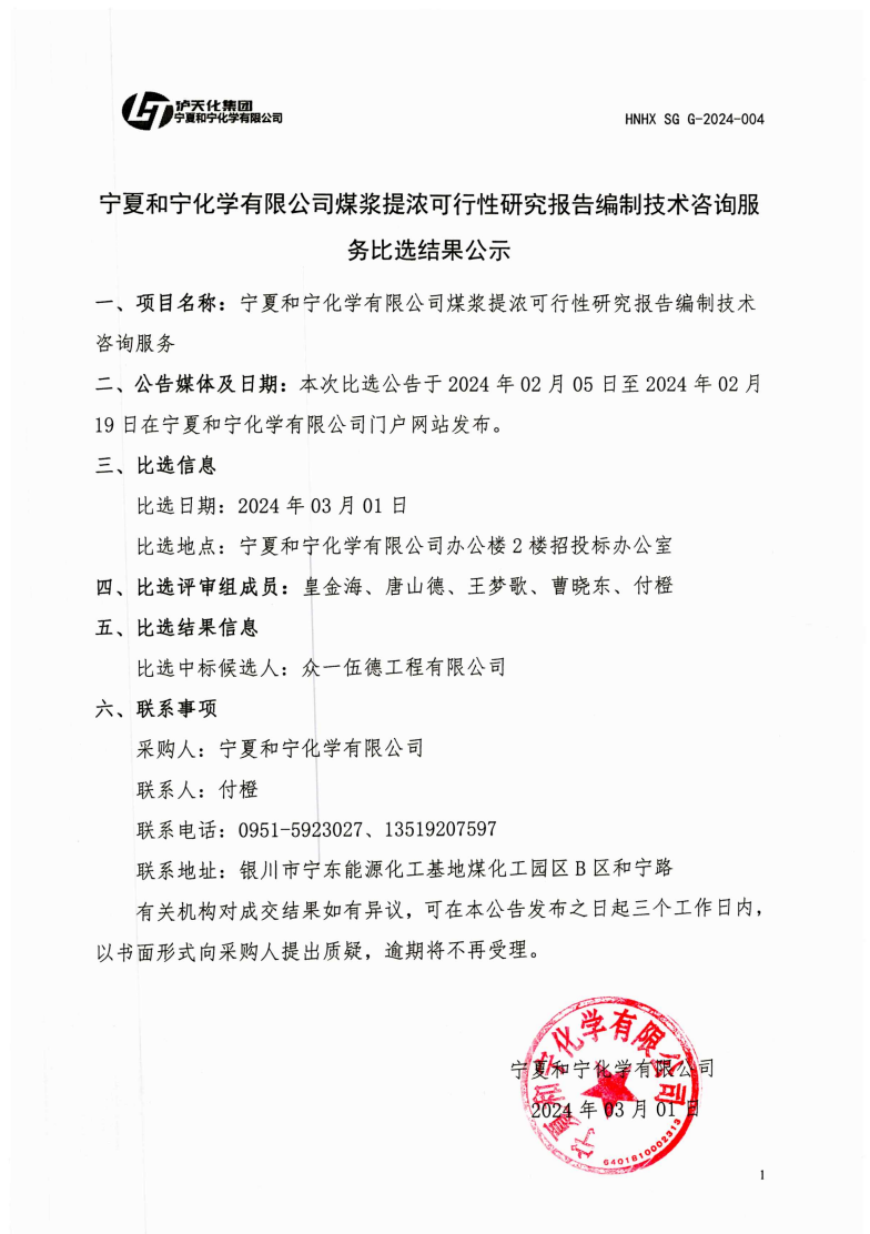 寧夏和寧化學有限公司煤漿提濃技術改造項目可行性研究報告編制技術咨詢服務比選結果公...