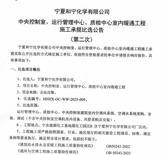 2025-07-02寧夏和寧化學有限公司中央控制室、運行管理中心、質檢中心室內暖通工程施工承攬比選公告(第二次).pdf [全文]