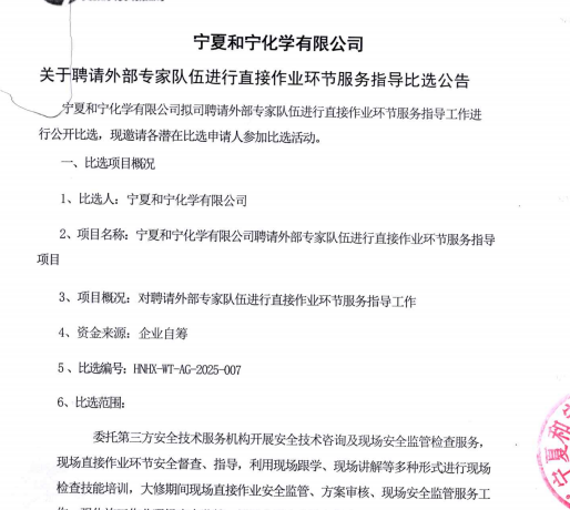 2025-07-08寧夏和寧化學有限公司關于聘請外部專家隊伍進行直接作業環節服務指導比選公告.pdf [全文]