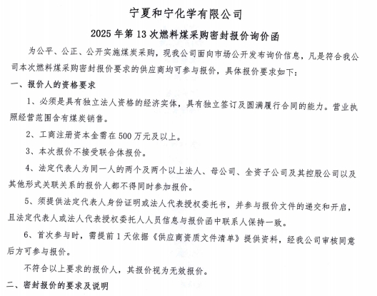 2025-07-10寧夏和寧化學有限公司2025年第13次燃料煤采購密封報價詢價函.pdf [全文]