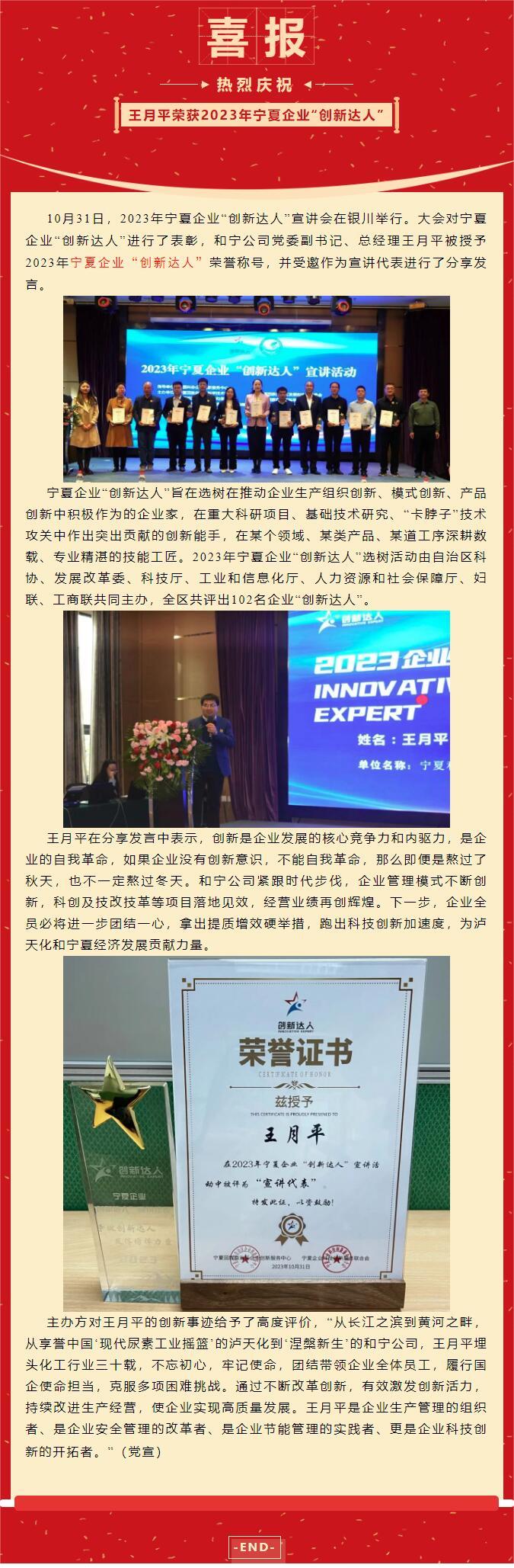 熱烈慶祝王月平榮獲2023年寧夏企業“創新達人”