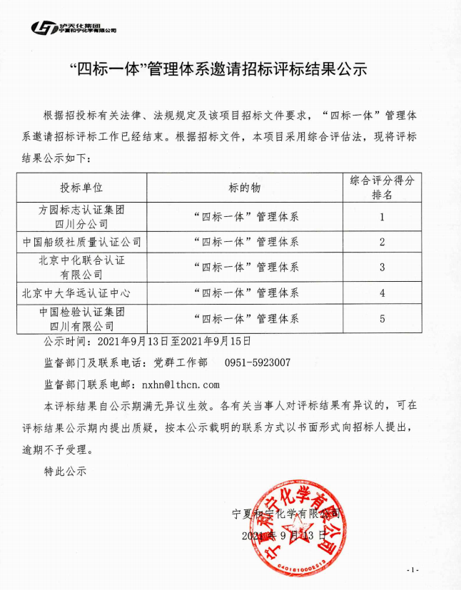 “四標(biāo)一體”管理體系邀請(qǐng)招標(biāo)評(píng)標(biāo)結(jié)果公示