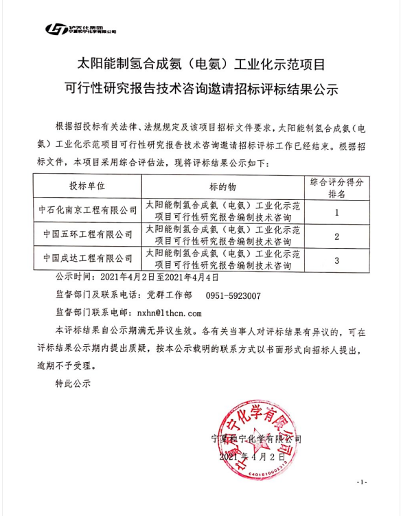 太陽(yáng)能制氫合成氨(電氨)工業(yè)化示范項(xiàng)目招標(biāo)評(píng)標(biāo)結(jié)果公示