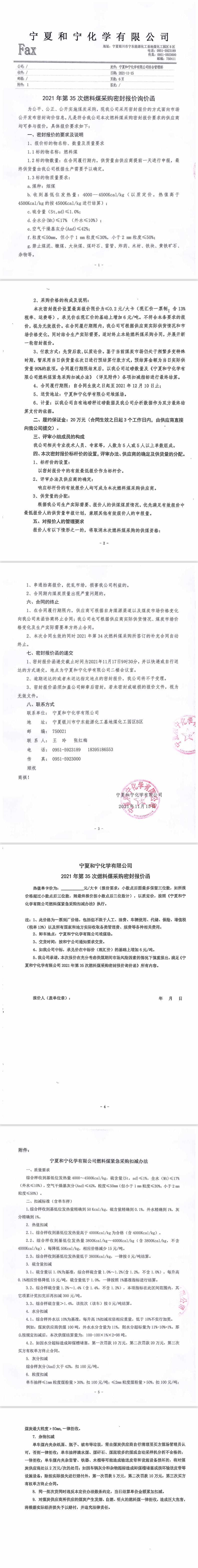 2021年第35次燃料煤采購密封報價詢價函及報價函