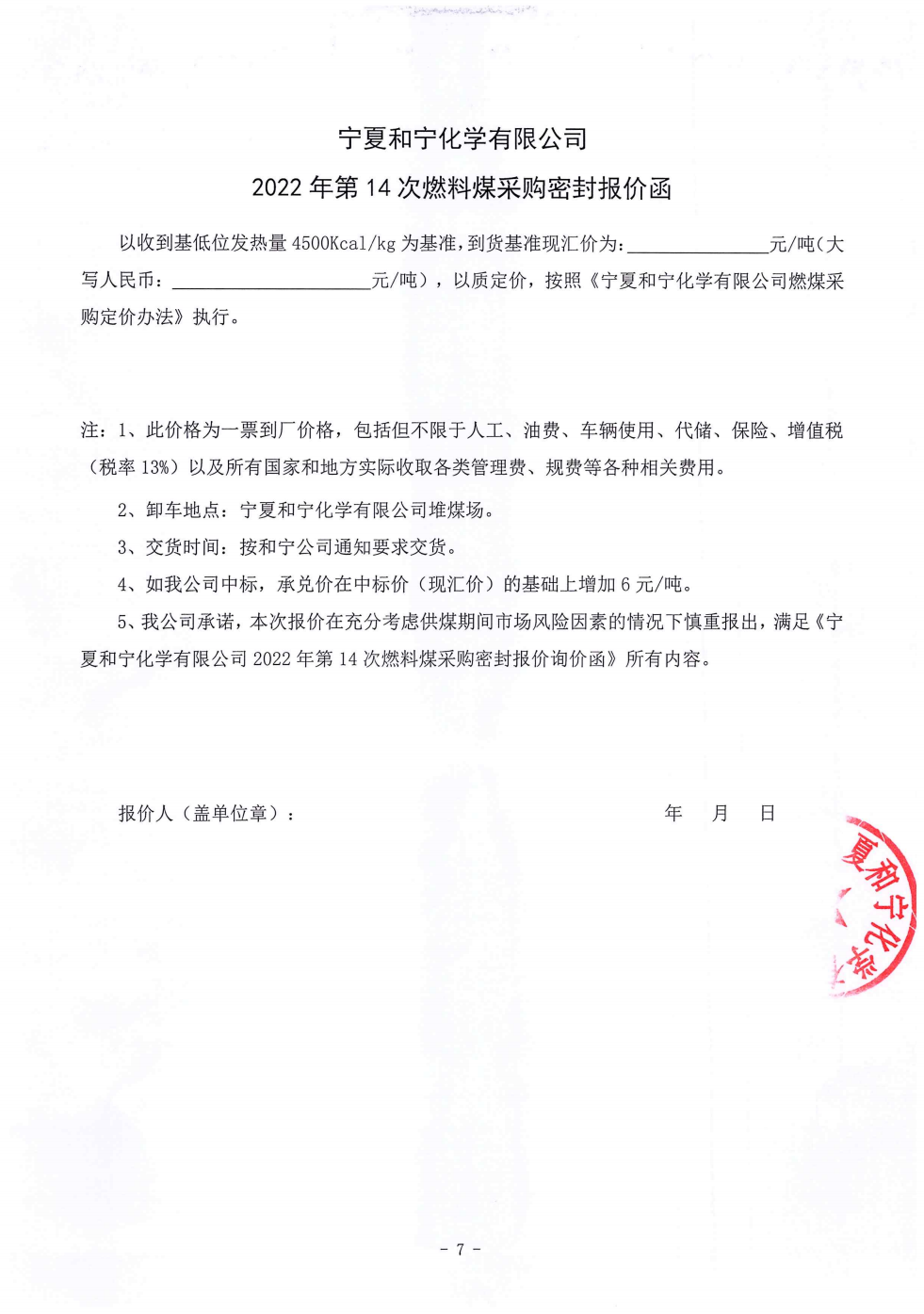 寧夏和寧化學(xué)有限公司2022年第14次燃料煤采購密封報價詢價函