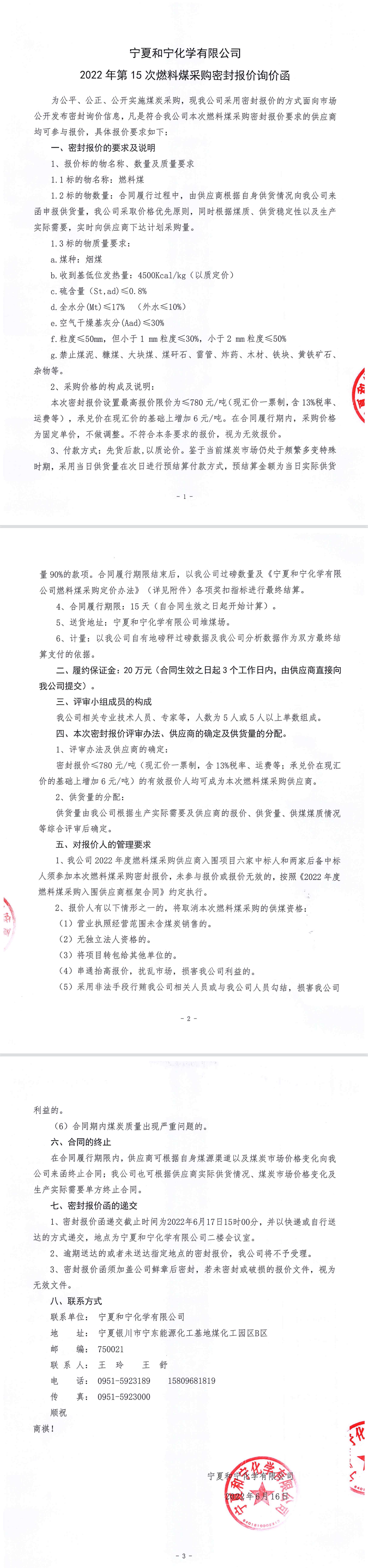 寧夏和寧化學有限公司2022年第15次燃料煤采購密封報價詢價函