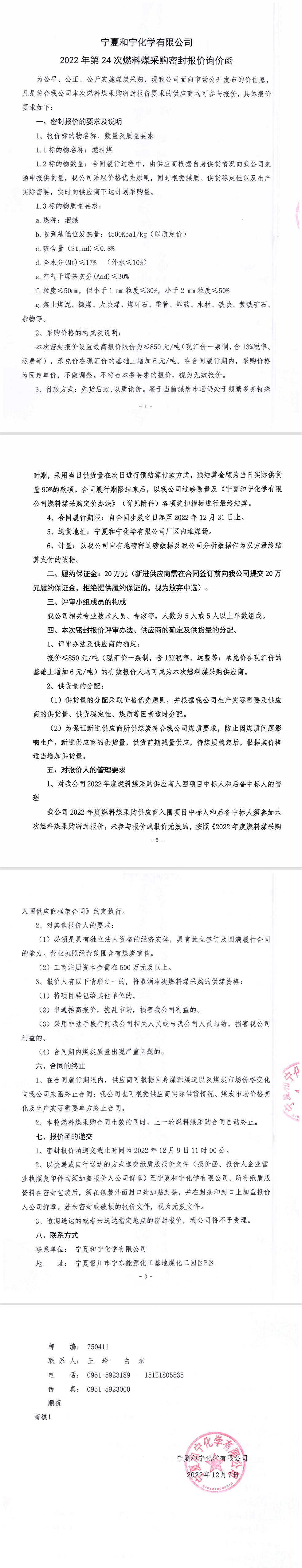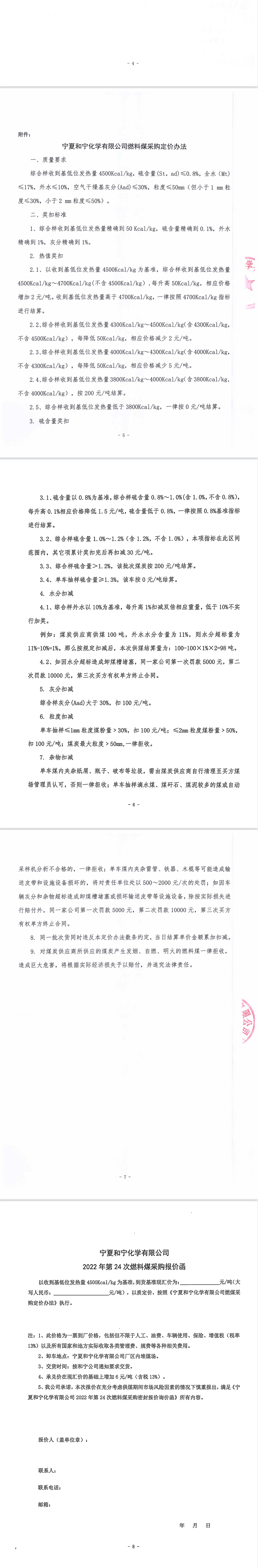寧夏和寧化學(xué)有限公司2022年第24次燃料煤采購(gòu)密封報(bào)價(jià)詢價(jià)函