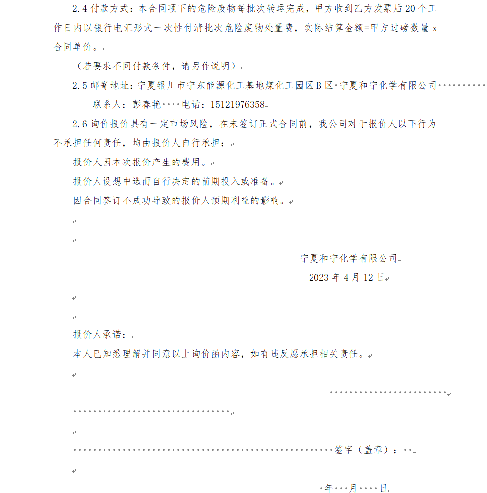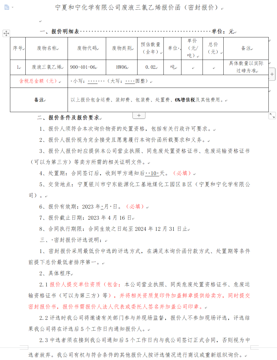 寧夏和寧化學有限公司廢液三氯乙烯報價函(密封報價)