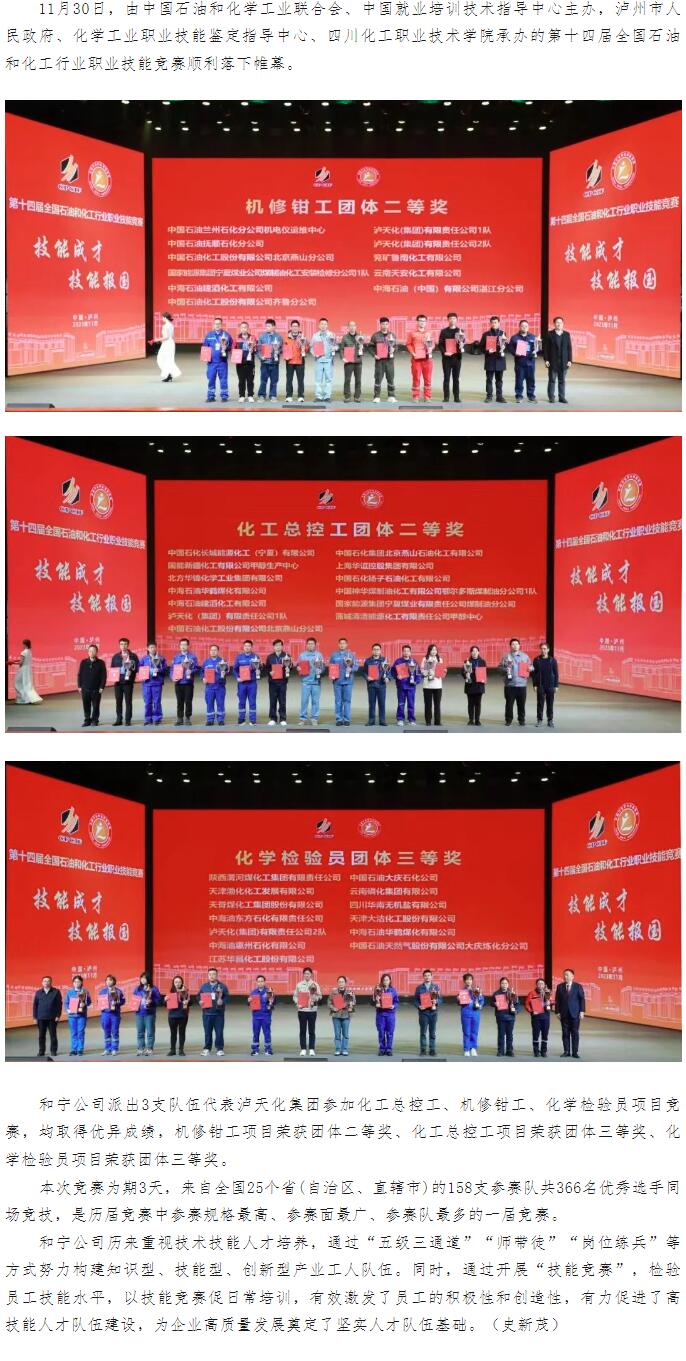 瀘天化和寧公司三支代表隊在全國石油和化工行業職業技能競賽中獲佳績