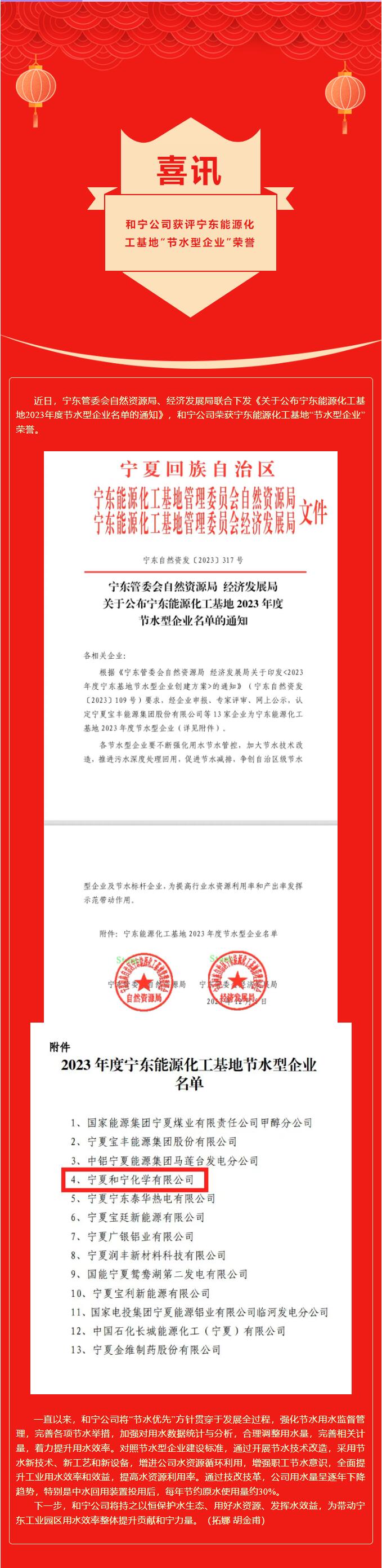 喜訊!和寧公司獲評(píng)寧東能源化工基地2023年度“節(jié)水型企業(yè)”榮譽(yù)